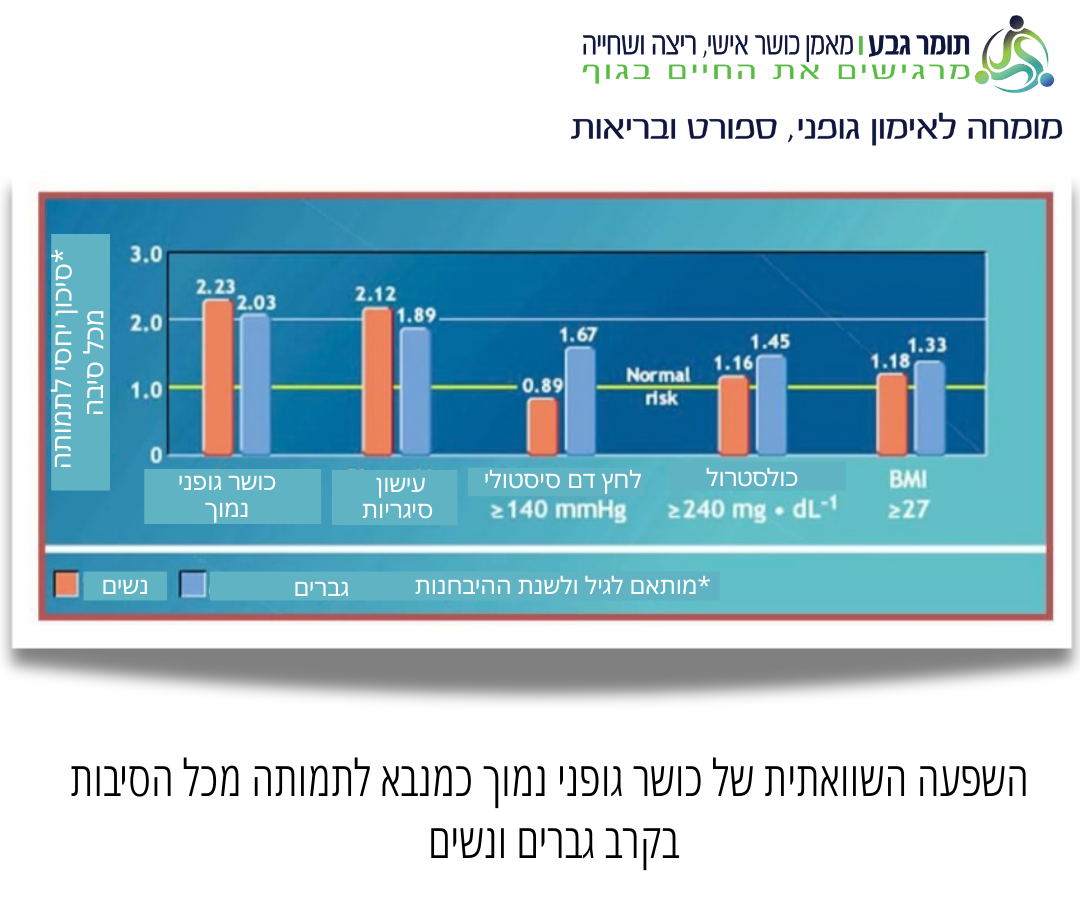 - רמת כושר אירובי נמוכה מהווה מנבא עצמאי חזק לתמותה, ללא קשר לגורמי סיכון אחרים.